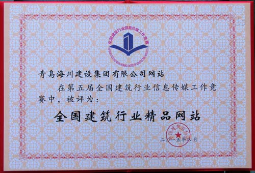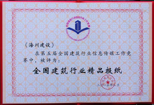 8月26日,中國建筑業(yè)協(xié)會在大連召開的全國建筑行業(yè)信息傳媒工作經驗交流會上,向第五屆全國建筑行業(yè)信息傳媒工作競賽的優(yōu)勝者頒發(fā)了獎杯和榮譽證書。海川集團被評為“全國建筑行業(yè)信息宣傳先進集體”,公司網站被評為“全國建筑行業(yè)精品網站”,《海川建設》企業(yè)報被評為“全國建筑行業(yè)精品報紙”,王修岐同志被評為“全國建筑行業(yè)信息宣傳優(yōu)秀工作者”。